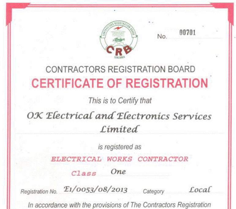 1. Currently, OK Electrical and Electronics Services Ltd is registered member of the Business Registrations and Licensing Authority (BRELA).